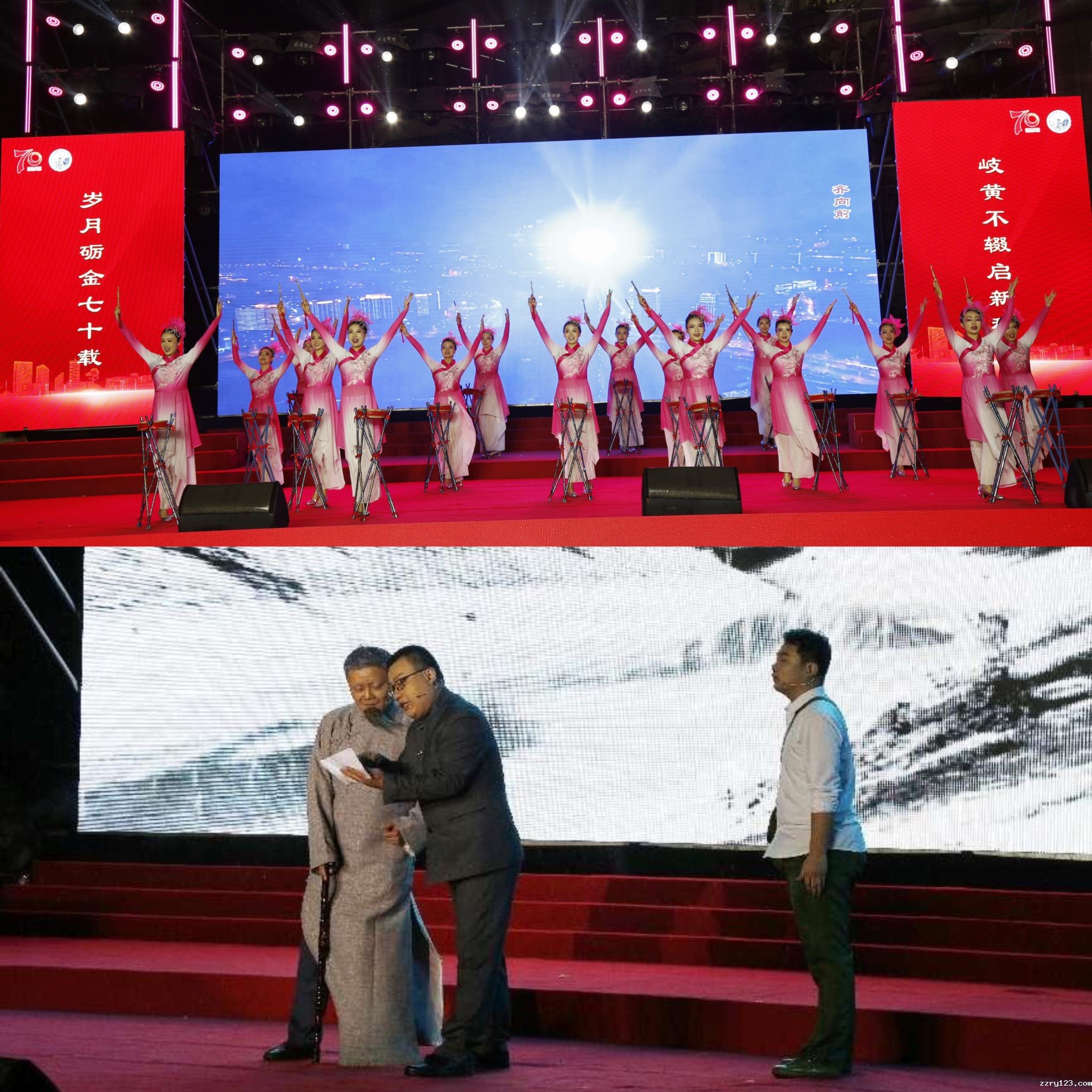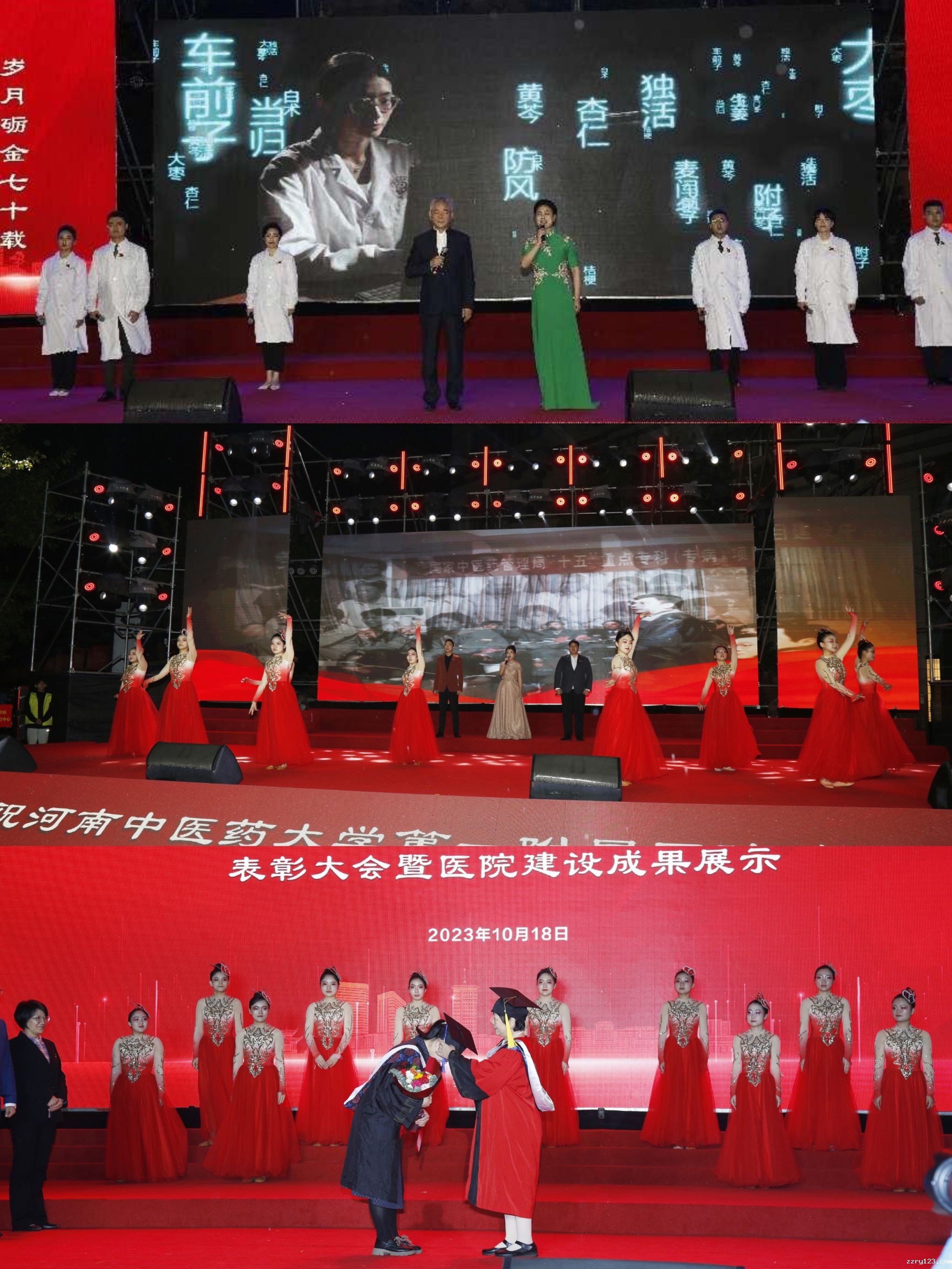 随后医院建设成果在《我和我的祖国》《中医之歌》的合唱中拉开序幕,活动以“启:同舟楫桨”“寻:同道岐黄”“创:同心济世”“追:同心筑梦”四个篇章全面展现医院发展历程和在医、教、研、管、文化等各方面取得的成效。现场节目除由医院岐黄艺术团表演呈现外,还特别邀请到了河南省话剧院国家一级演员于同云老师和蔡小艺老师,以及现任河南豫剧院副院长、河南豫剧院三团团长,河南省剧协副主席、中国戏剧家协会理事、国家一级演员,中国戏剧梅花奖得主贾文龙,著名豫剧表演艺术家、国家一级演员、中国戏剧梅花奖得主王红丽老师参演。