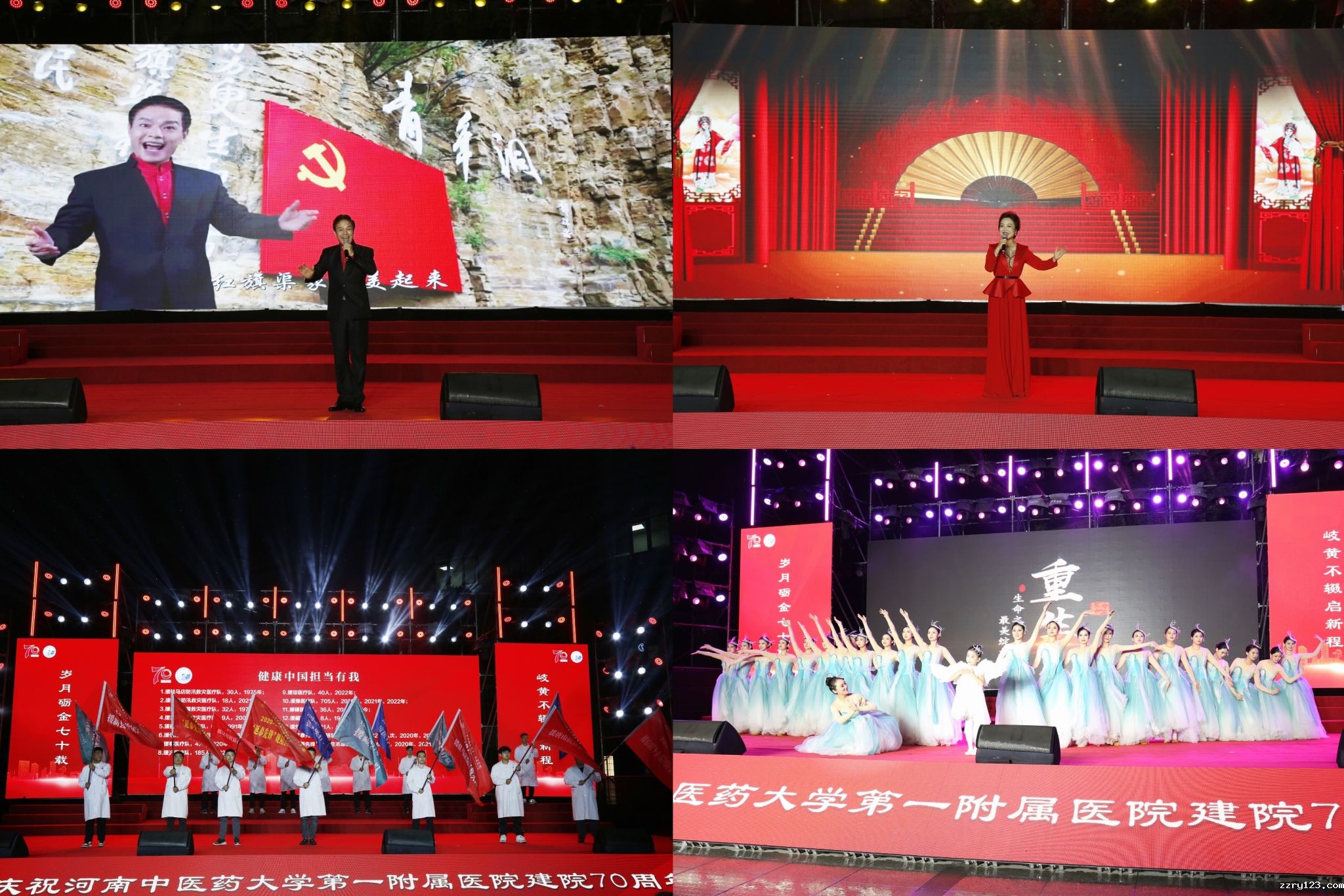 贾文龙老师现场演唱了豫剧经典《红旗渠精神传万代》《吃亏歌》两部作品,表现70年来,医院积极响应党和政府的号召,传承大爱无疆延泰后世的精神,主动承担了多次抢险救灾支援救助任务和基层服务工作,涌现了一支支特别能吃苦特别能战斗的队伍;《医者仁心》表现了一代代豫中医人秉持赤诚的医者仁心,践行大医精诚的精神;《学工阵线联盟》以轻快活泼的风格展示了师生风采,以及医院授业传道,薪火相继的情怀。