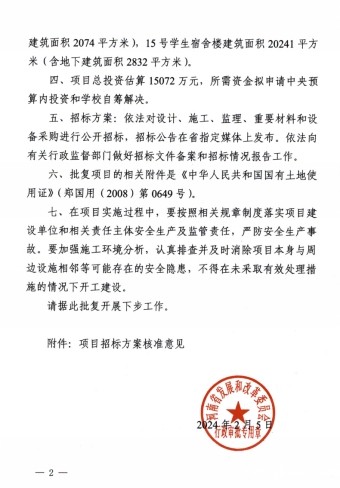 3.积极谋划新建项目。1号15号学生宿舍楼项目作为我校重要的民生工程,对缓解我校学生住宿压力,提升住宿环境质量有着重要作用。基建处提前谋划、提早入手、加紧实施,项目可行性研究报告于2024年2月5日获得省发改委批复。2024年6月27日通过公开招标确定了设计单位,同时启动项目初步设计。2024年11月13日,该项目初步设计取得省教育厅批复同意报送省发改委进行投资审核,并于12月24日完成了初步设计评审,初步设计方案得到了评审专家的充分肯定,为争取国拨资金、早日开工建设打下了良好基础。