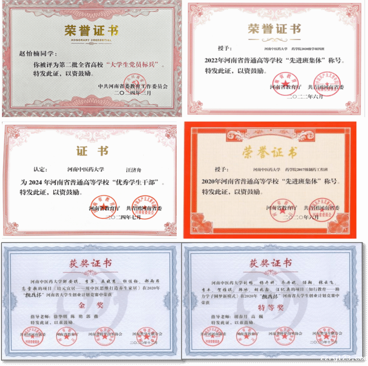 近年来本科生获创新创业竞赛省级以上奖项152项,其中包括第七届中国国际“互联网+”大学生创新创业大赛银奖、“药祖桐君杯”第三届全国中医药高等院校大学生创新大赛金奖等国家级奖项23项。获评全国优秀共青团员1人,省文明学生、三好学生、优秀学生干部等41人;省文明班级、先进班集体11个,获评全国活力团支部、省五四红旗团委。研究生培养质量显著提高,获得国家奖学金54人,获省文明学生、三好学生、优秀学生干部等11人;省优秀共产党员、省优秀共青团员3人;省创新之星5人;省优秀毕业生20人,获评河南省先进班集体、河南省文明班级等集体荣誉;中药传承人才培养模式2022年被评为河南省本科高校创新型人才培养典型案例。