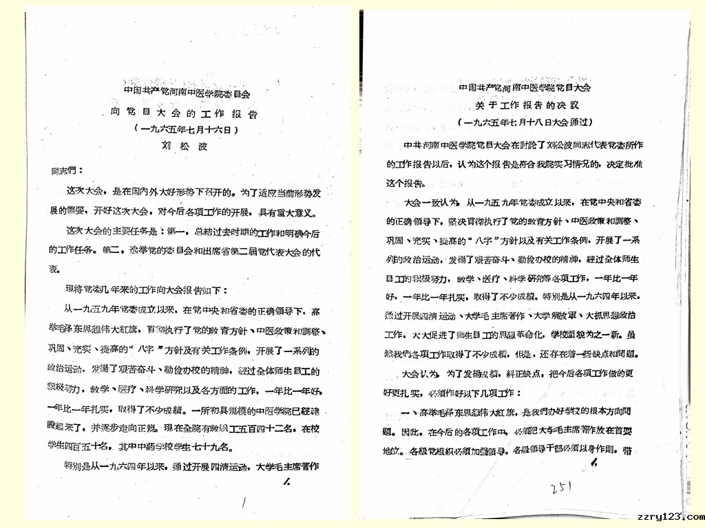 河南中医学院第一次党员大会于1965年7月16日至18日召开,刘松波同志代表党委向党员大会作工作报告,总结了过去时期的工作,提出了“为不断提高教学、医疗和科学研究工作质量,为争取各项工作的新胜利而奋斗”的目标。大会选举党委委员17人,党委常务委员8人,监察委员会委员7人;选举刘松波同志任党委书记,高炳衡同志任监委书记。