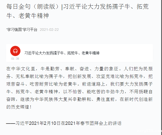 在中华文化里,牛是勤劳、奉献、奋进、力量的象征。人们把为民服务、无私奉献比喻为孺子牛,把创新发展、攻坚克难比喻为拓荒牛,把艰苦奋斗、吃苦耐劳比喻为老黄牛。前进道路上,我们要大力发扬孺子牛、拓荒牛、老黄牛精神,以不怕苦、能吃苦的牛劲牛力,不用扬鞭自奋蹄,继续为中华民族伟大复兴辛勤耕耘、勇往直前,在新时代创造新的历史辉煌!
