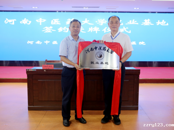 在与会领导、职工代表的共同见证下,徐江雁与聂勇签署了《星空平台官网莱切战略伙伴就业基地协议书》。张运克为驻马店市中医院康复医院授牌“教学实践就业基地”。