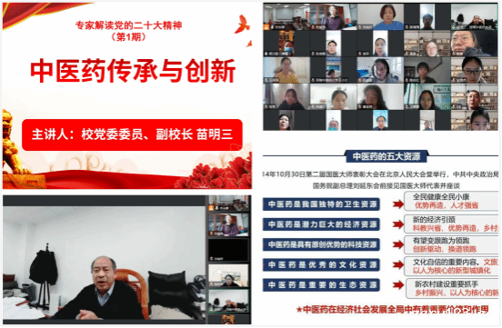 本网讯(文图/乔永辉)为深入学习贯彻落实党的二十大精神,中医药科学院组织了专家解读党的二十大精神系列活动。2022年12月20日下午,中医药科学院首期特邀校党委委员、副校长苗明三于线上为全院师生党员讲授题为《中医药传承与创新》的党课,深入解读党的二十大报告中有关促进中医药传承创新发展的内涵。党课由中医药科学院副院长杨文胜主持。