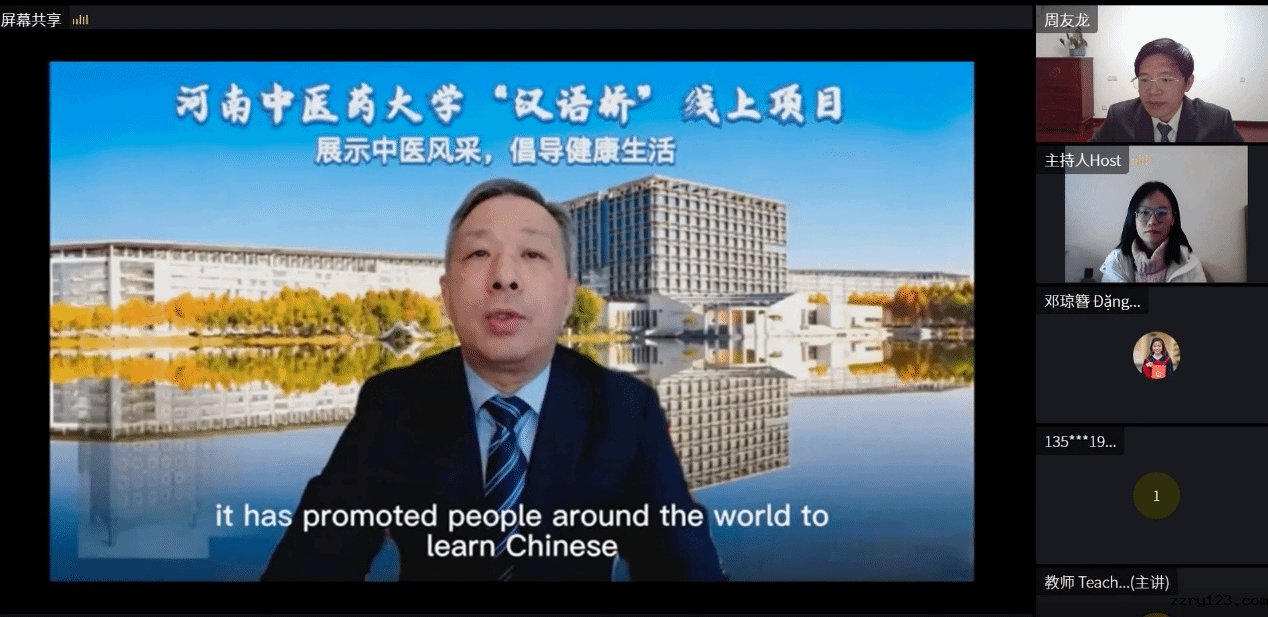“汉语桥”是中国教育部中外语言交流合作中心举办的面向全球展示中国文化的知名品牌项目,今年是我校第一次承办 “汉语桥”线上团组交流项目,该项目围绕中医药文化特点,以“展示中医风采,倡导健康生活”为主题展开。我校国际教育学院、外语学院等多个学院、学科老师组成的项目团队克服了新冠肺炎疫情带来的多重困难,以中文教学为基础,融合中原及中医文化,采用直播授课、视频录播课等方式向海外学子全方位展示了中原商都文化、中医药博物馆宝藏、河南美食与名茶、针灸、推拿、刮痧、太极等中国传统文化,力求通过“汉语桥”向全球各国人民讲好中国故事、传播中医药文化。
