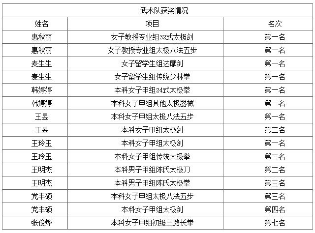 近年来,学校高度重视加强和改进体育工作,全力支持中华优秀传统体育项目的传承和发展,校武术队制定了一系列科学、严格、精细的训练计划,教练与队员们刻苦训练、积极备战,通过多种形式克服难以集中备赛的困难,最终在河南省大学生武术锦标赛中,屡创佳绩。
