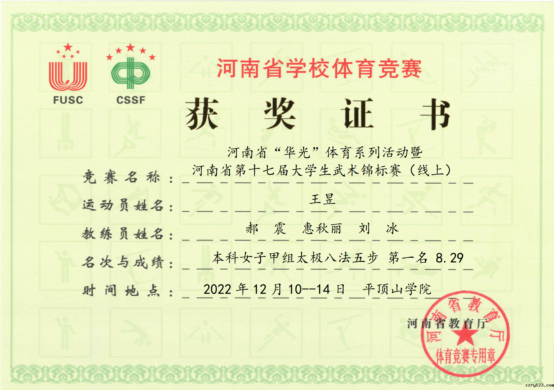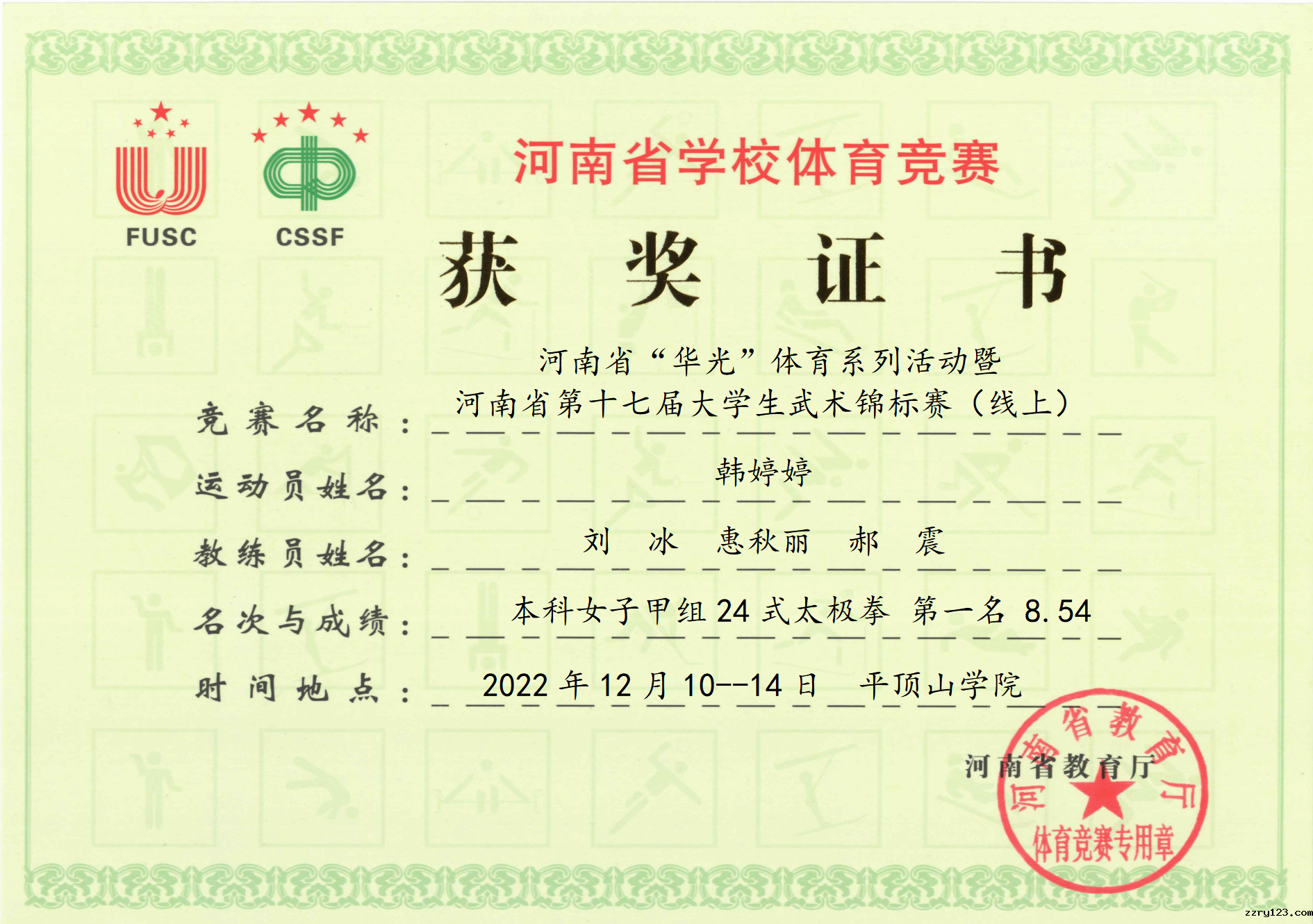 本网讯(文图/刘冰)2022年11月15日,我校武术队参加了由河南省教育厅主办、平顶山学院承办的2022年河南省“华光”体育系列活动暨河南省第十七届大学生武术锦标赛(线上)竞赛、河南省第四届国际留学生(线上)武术锦标赛、河南省第四届高校“校长杯”太极拳锦标赛暨首届武术技能大赛(线上)竞赛。经过51支代表队的激烈角逐,我校武术代表队共获得8枚金牌、3枚银牌、2枚铜牌,1个第四名、1个第七名的优异成绩。