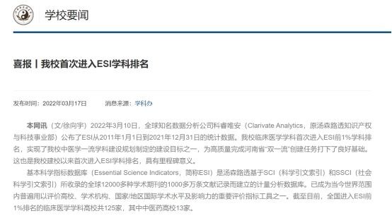 2022年3月10日,我校临床医学学科首次进入ESI前1%学科排名,实现了我校中医学一流学科建设规划制定的建设目标之一,为高质量完成河南省“双一流”创建任务打下了良好基础,这是我校建校以来首次进入ESI学科排名,具有里程碑意义。2022年,我校持续以学科建设为龙头,突出特色学科优势争创“双一流”,先后召开学科优化调整会、“双一流”创建学科中医学学科建设规划论证会、交叉学科建设研讨会、重点学科终期验收工作推进会等,不断优化整合学科布局,大力释放学科建设活力,提升学科建设整体水平,为全面提升服务经济社会发展的水平和能力奠定良好基础。