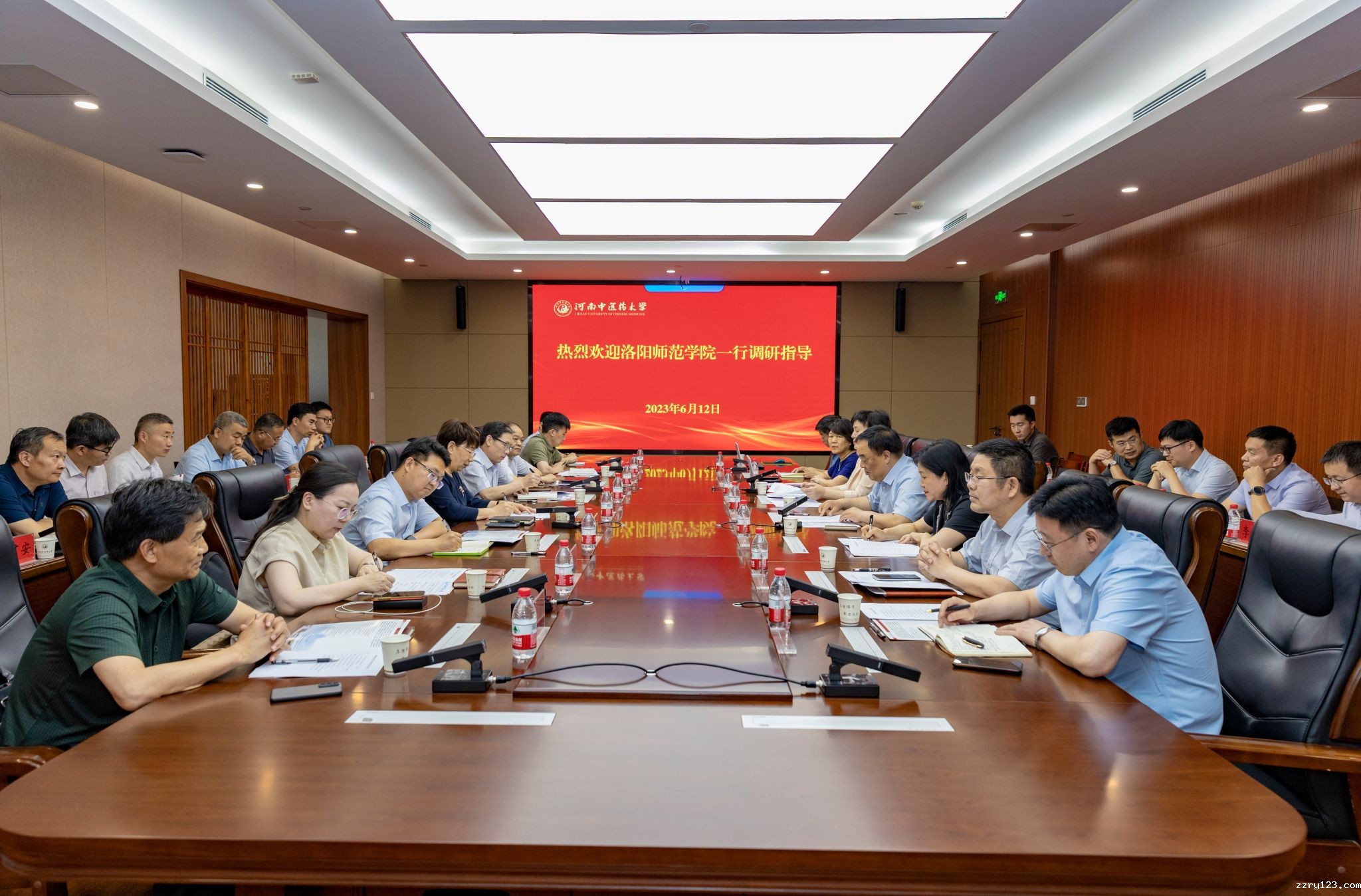 本网讯(文/李昌 图/郭寅虎)6月12日,洛阳师范学院党委书记郭改英一行来校访问交流,学校在俊学综合实验楼召开座谈会。校长王耀献会见了郭改英书记一行,学校党委副书记、工会主席张小平,校党委委员、副校长田力出席座谈会。两校党委办公室、组织部、学工部、教务处、发展规划处、后勤服务中心及书院的负责同志参加会议,会议由田力主持。