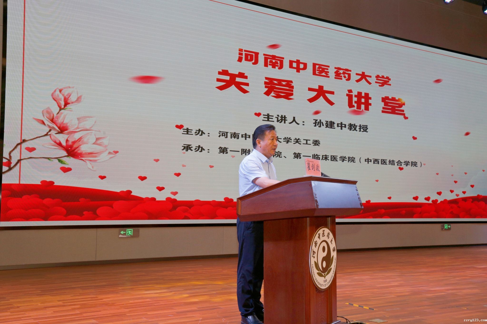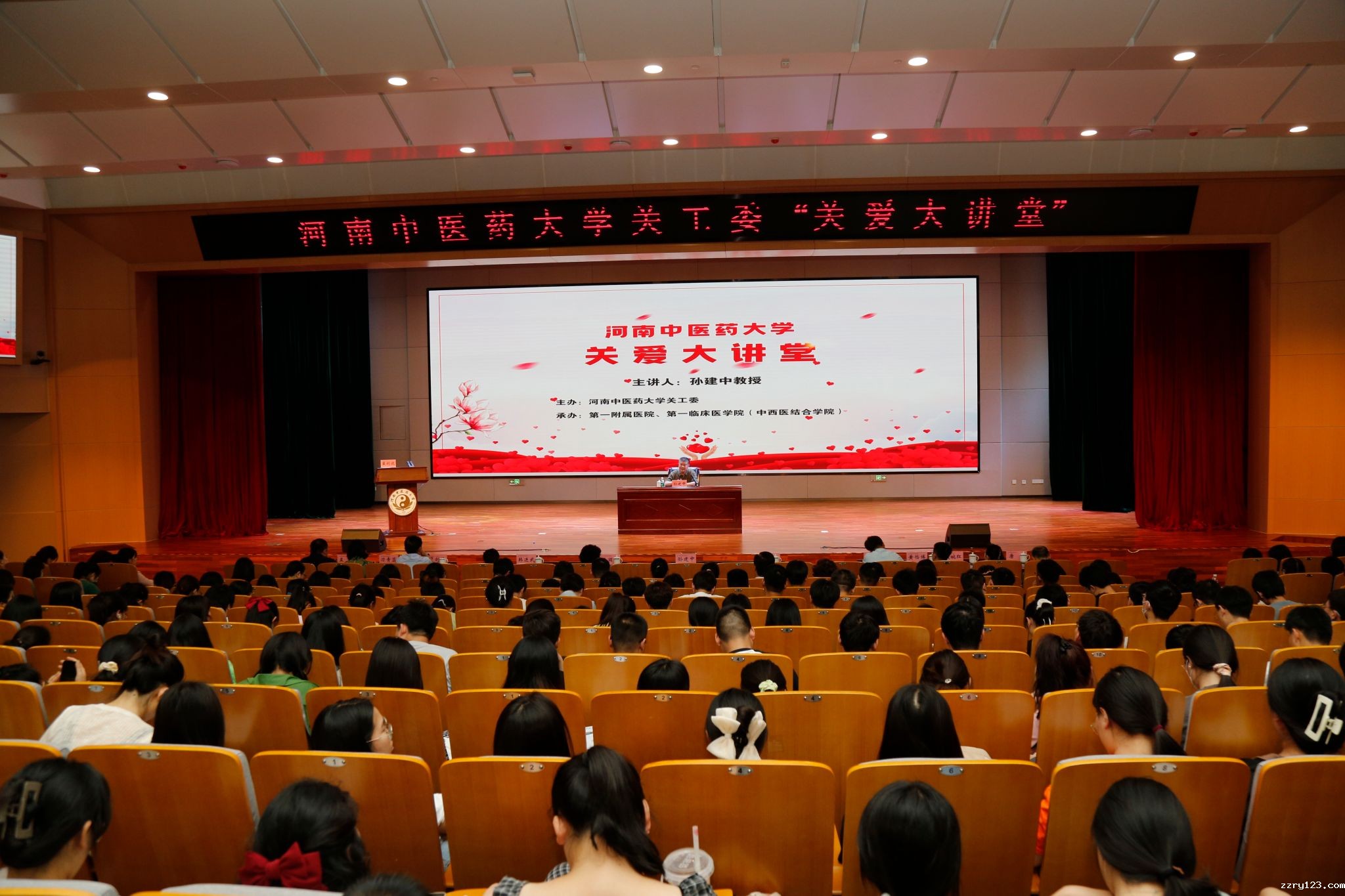 本网讯(文/范璐璐 图/赵庆庆)2023年6月12日,由学校关工委主办、第一临床医学院(中西医结合医学院)承办的“关爱大讲堂”如期举行。邀请学校关工委名誉主任、我校原党委书记孙建中教授以《让青春在奋斗中闪光》为题做首场报告。我校关工委常务副主任、原党委副书记张丽霞,校党委副书记、工会主席张小平出席报告会,关工委、离退工作处、研究生工作部、校团委、一附院主要负责人,各二级学院(书院)关工委负责人、联络员,一临床即将离校的五百余名2023届毕业生参加了此次报告会。报告会由第一临床医学院党委书记翟剑波主持。