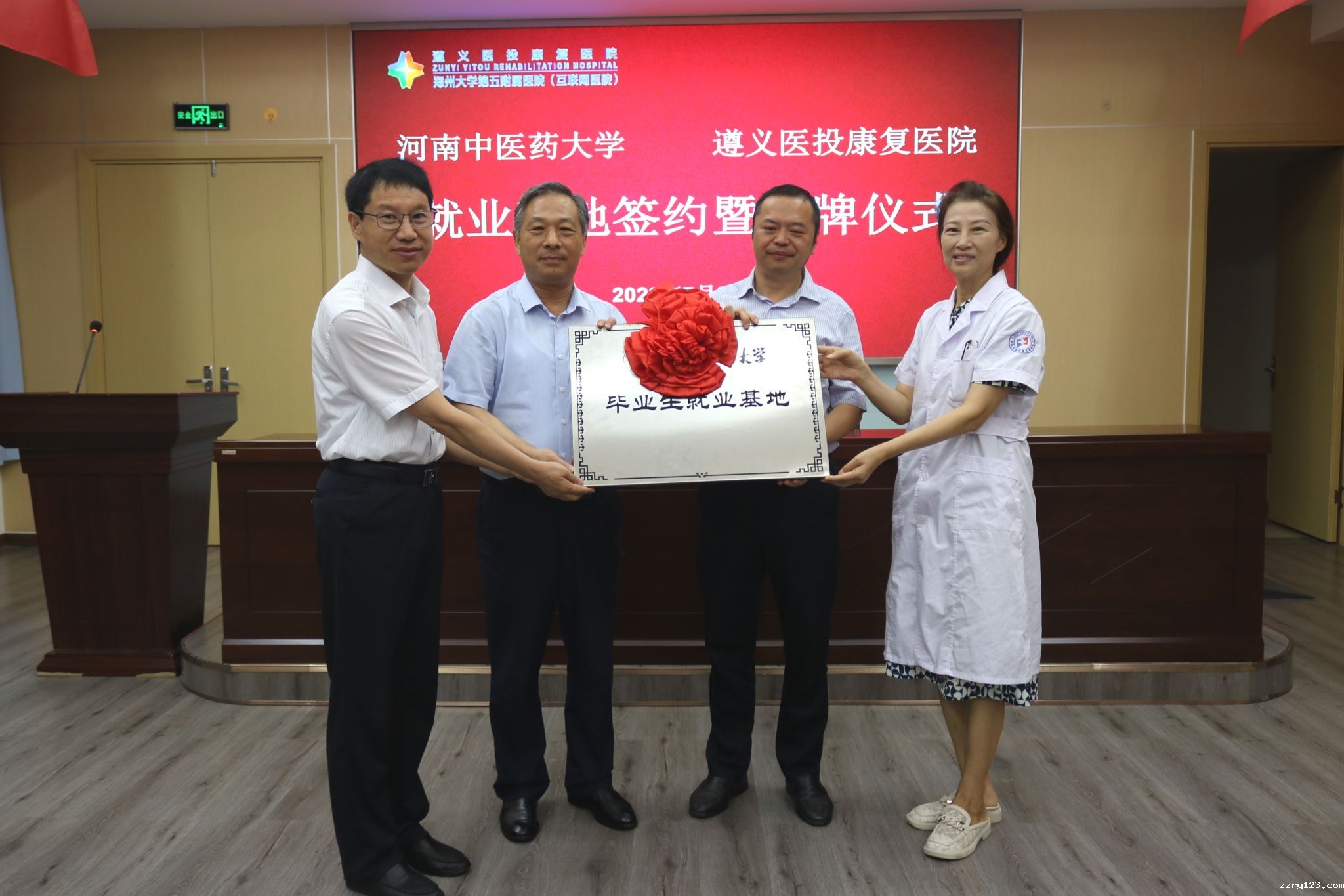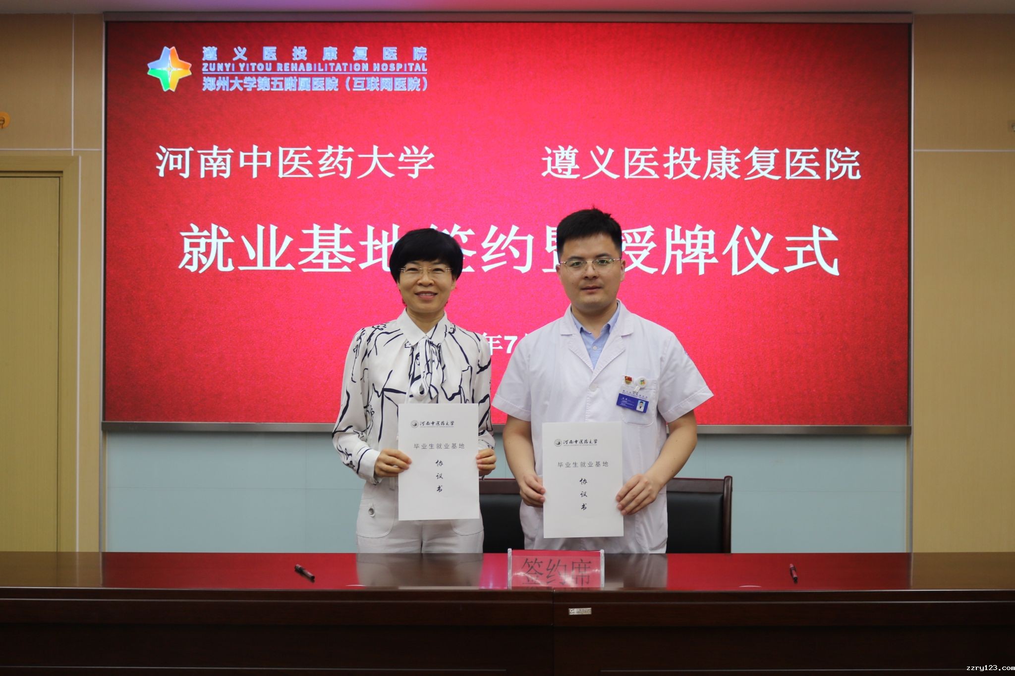 本网讯(文图/郝恬然)为深入贯彻落实党的二十大精神,扎实做好教育部、省委关于访企拓岗促就业专项行动部署,2023年7月26日,我校党委委员、副校长徐江雁带领教务处、体育学院一行赴遵义医投康复医院和仁怀新朝阳医院考察调研,举行就业基地签约授牌仪式。河南省人力资源和社会保障厅就业局二级调研员徐新奎,遵义市科学技术协会党组书记赵振东,遵义遵投洪善堂医疗管理有限公司董事长袁丁、总经理孙良,遵义医投康复医院领导班子及医护人员代表参加签约授牌仪式。