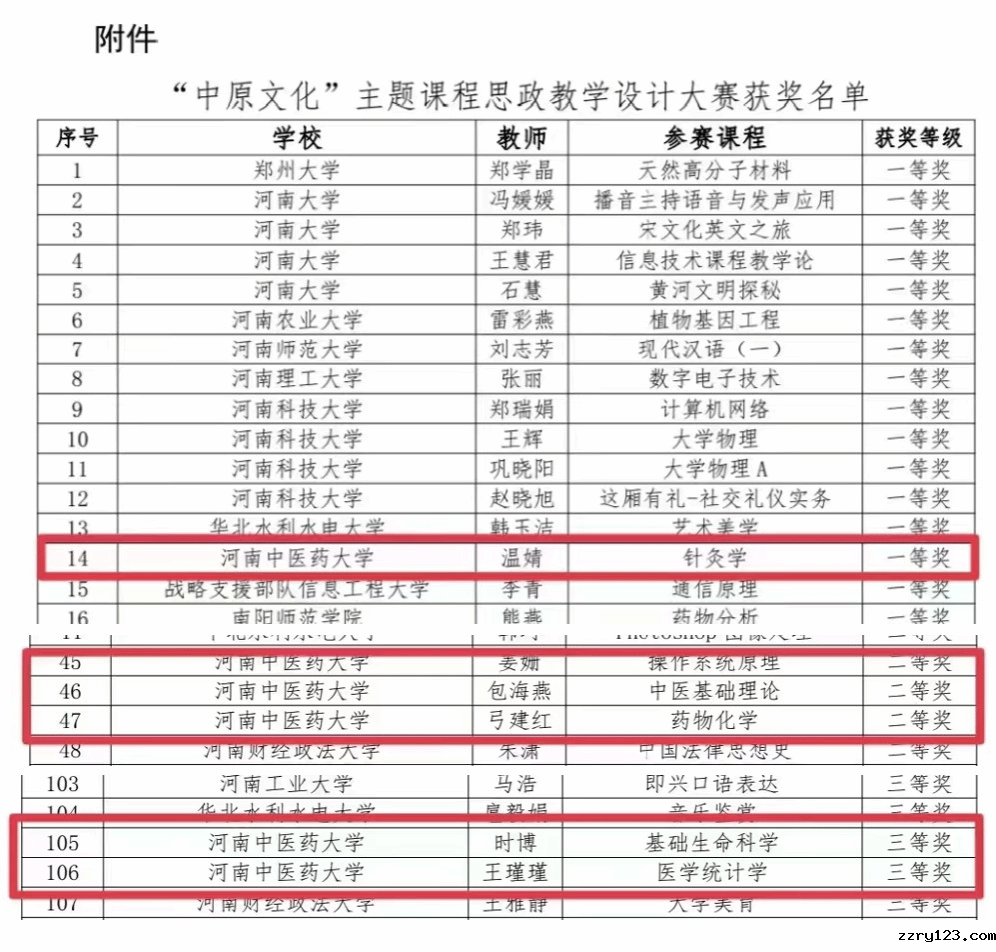 本网讯(文/图 闫秀娟)近日,河南省高等教育学会公布了河南省“中原文化”主题课程思政学设计大赛获奖名单,我校选派的6位教师在此次大赛中均取得佳绩,其中针灸推拿学院温婧老师荣获一等奖,信息技术学院姜姗老师、中医学院包海燕老师、药学院弓建红老师荣获二等奖,药学院时博老师、医学院王瑾瑾老师荣获三等奖。