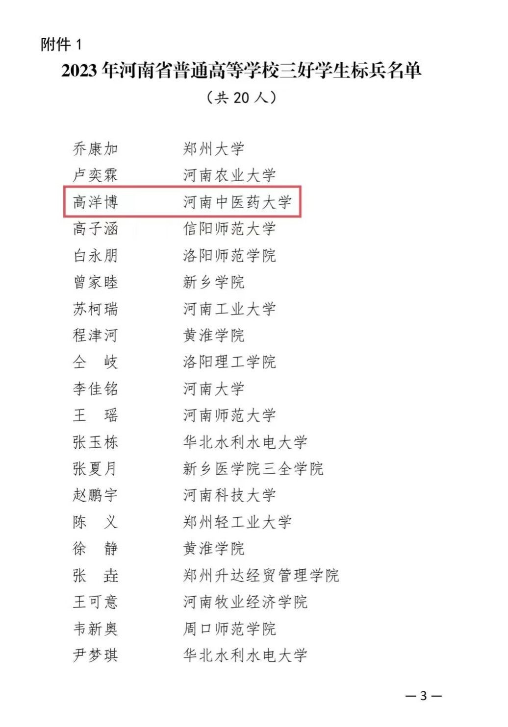 本网讯(文/图 郭薇)近日,共青团河南省委、河南省教育厅印发《关于公布2023年河南省普通高等学校三好学生标兵、三好学生标兵提名奖、三好学生标兵入围奖名单的通知》,全省共评选出三好学生标兵20人、三好学生标兵提名奖20人、三好学生标兵入围奖20人。我校第五临床医学院高洋博同学荣获“三好学生标兵”荣誉称号。