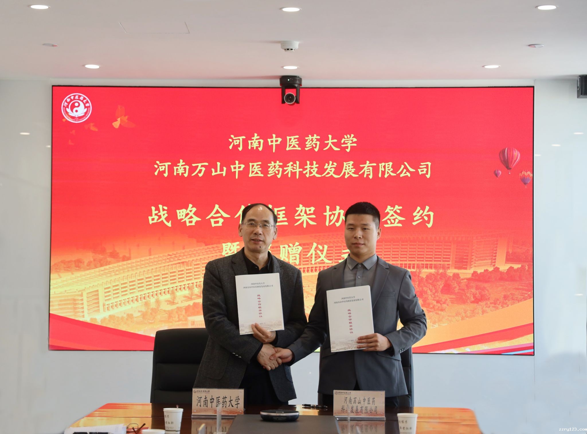 本网讯(文/图 常征辉)2024年1月5日,我校与河南万山中医药科技发展有限公司合作框架协议签约暨捐赠仪式在俊学综合实验楼10楼会议室举行。河南万山中医药科技发展有限公司投资人赵来宾,法人、董事长崔乾隆,总经理王卓勤,学校党委副书记张加民,教育发展基金会副理事长、秘书长刘延江出席了仪式。仪式由校友与社会合作办公室主任施淼主持。