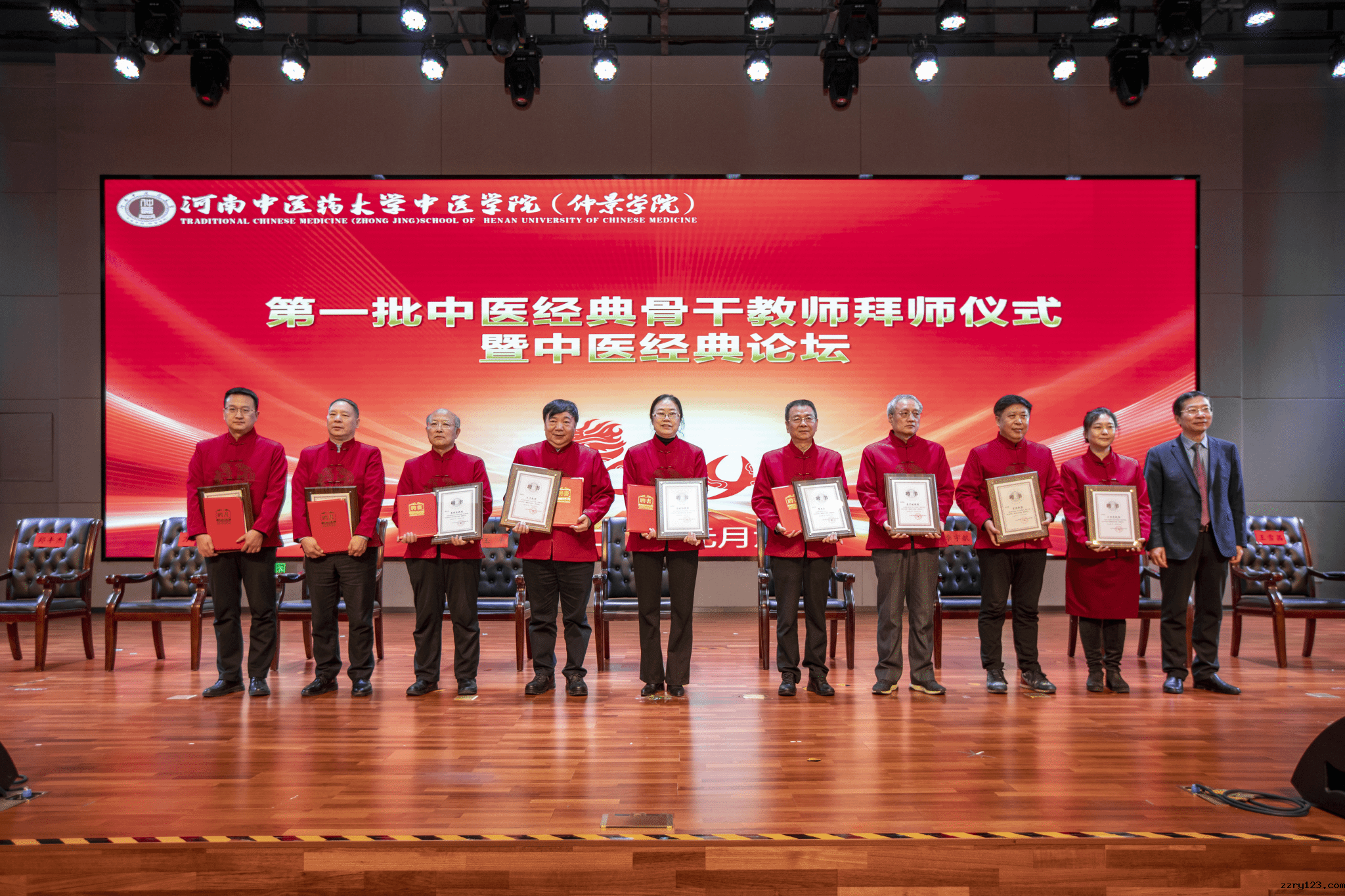 本网讯(文/张文娴 图/郭寅虎)一元复始,万象更新。2024年1月6日,我校在龙子湖校区俊学综合实验楼B101报告厅隆重举办第一批中医经典骨干教师拜师仪式暨中医经典论坛。北京中医药大学谷晓红教授、翟双庆教授、李宇航教授、陈明教授、王雪茜教授、郑丰杰教授,湖北中医药大学王平教授,浙江中医药大学万海同教授,黑龙江中医药大学姜德友教授作为学术导师出席了活动。我校校长王耀献教授,副校长张振强教授,党委教师工作部、人事处、科学技术处、计划财务处、校团委、学科建设办公室等部门负责人,中医学院(仲景学院)全体职工,以及仲景班学生共500余人参加了本次活动。