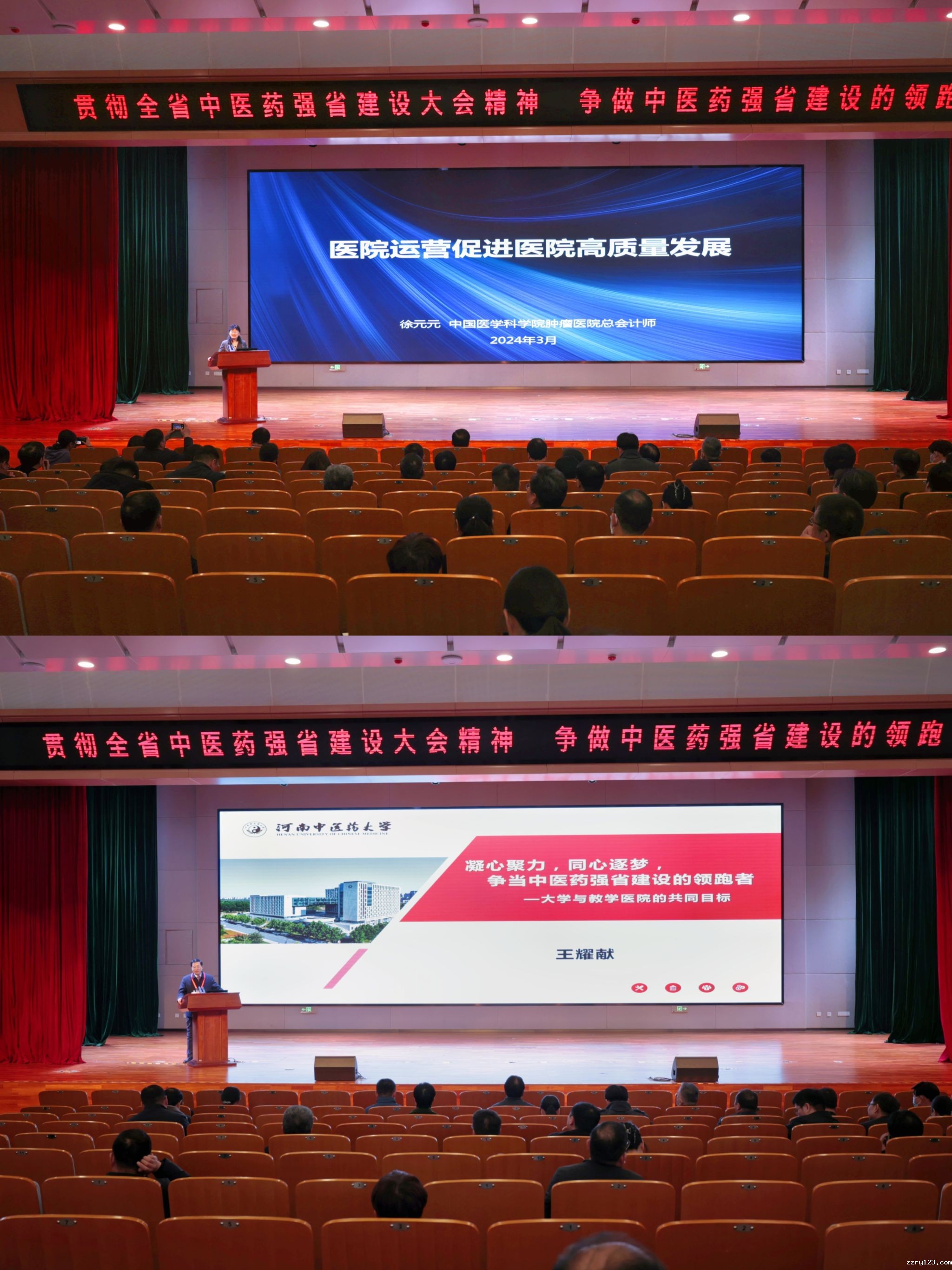 3月9日,中国医学科学院肿瘤医院总会计师徐元元和我校校长王耀献分别以《医院运营促进医院高质量发展》《凝心聚力 同心逐梦 争当中医药强省建设的领跑者》为题作专题讲座。徐元元围绕新形势下医院运营管理的新要求、建立健全医院运营管理体系、医院运营管理的实践三个方面,以丰富的案例、详实的数据、专业的见解深入讲解如何找准医院高质量发展路径,建设高水平医院。王耀献围绕理论阐释,大学教学医院高质量发展,大学教学医院初心与使命,中医药强省建设、教学医院何为四个方面,深入讲解大学与教学医院的历史逻辑、现实逻辑、理论逻辑,详细阐释了实现教学医院高质量发展的十大要素与重点环节,表示教学医院要牢记初心使命,强科研、重教学、育人才,与大学聚力共奋进、筑梦谱新篇。