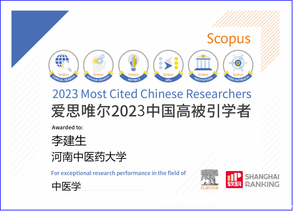 本网讯(文/图 徐向宇)2024年3月27日,全球性信息分析公司爱思唯尔(Elsevier)发布了2023“中国高被引学者”(Highly Cited Chinese Researchers)榜单,我校中医学学科李建生教授和中药学学科张志娟教授再度入选。截至目前,两位学者已连续三年入选该榜单,为我校“双一流”创建工作发挥了榜样和引领作用。