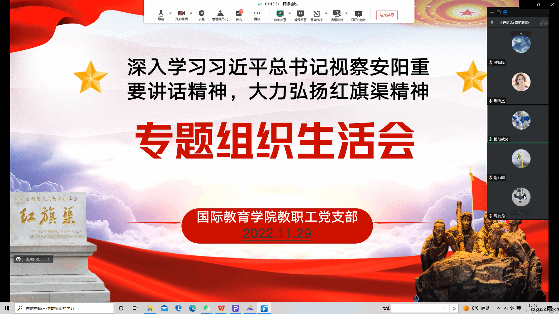 二是重视党内组织生活,不断提升组织活力。学院教职工党支部在学习党的二十大精神基础上,结合“深入学习习近平总书记视察安阳重要讲话精神,大力弘扬红旗渠精神”召开专题组织生活会,在线上开展党的二十大精神学习交流分享;从实际出发,以深刻领悟、躬身践行红旗渠精神为主题开展批评和自我批评,真正达到了深刻剖析问题,明确努力方向,自我提升、相互促进的目的;学生党支部结合院系实际,开展了丰富多彩的主题活动。开设“喜迎党的二十大”专栏,开办辅导员领学“党的二十大精神”专题课堂,开展主题党日、主题班会、配音大赛、朗诵活动、征文比赛等,带动全院学生原原本本读原文、认认真真悟原理,做到真学真懂真信真用,进一步引导广大学生学深悟透党的二十大精神。
