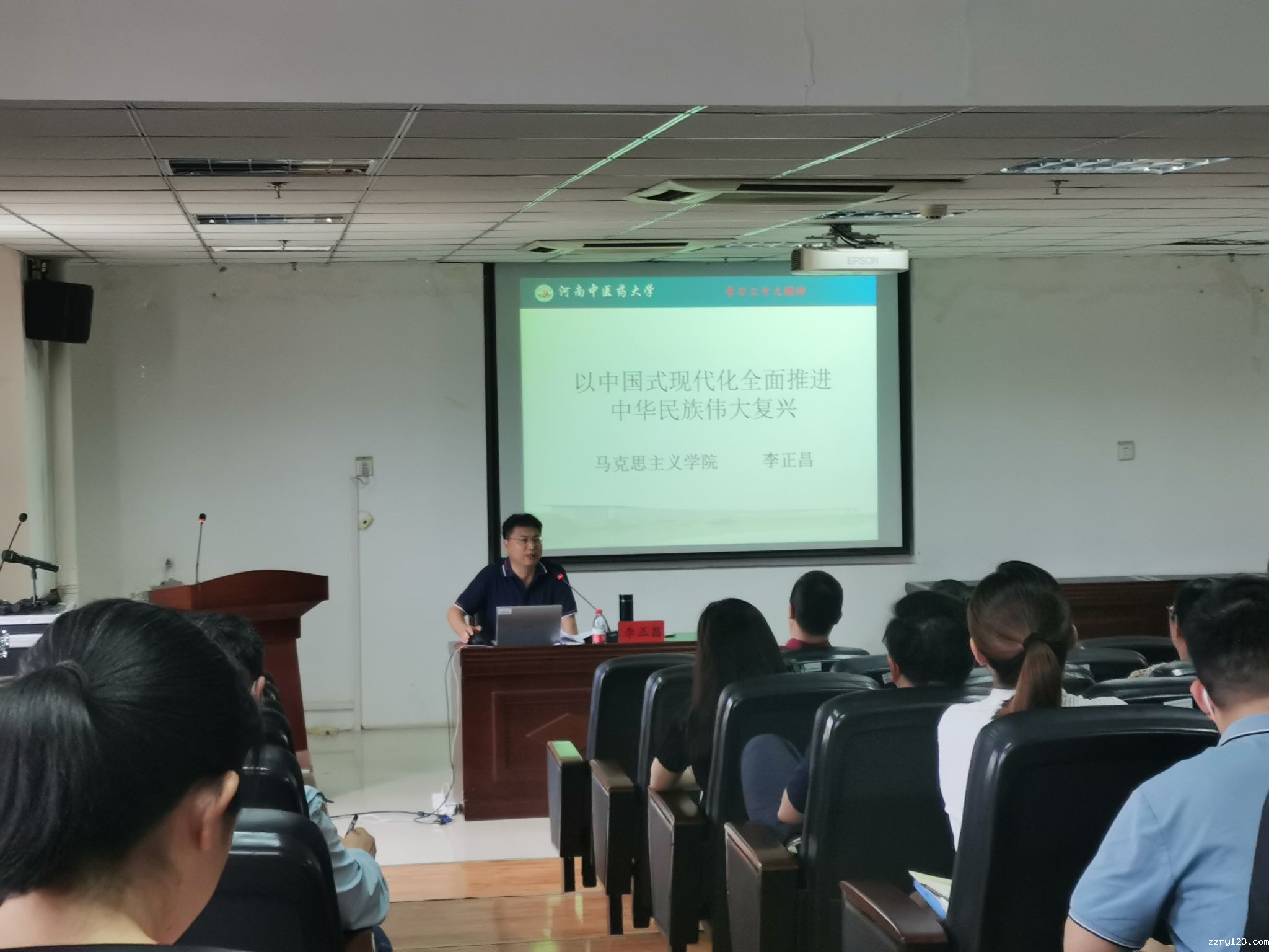 本网讯(文/图 赵琪璐)为深入学习宣传贯彻党的二十大精神,2023年6月6日下午,药学院邀请我校党的二十大精神宣讲团成员、马克思主义学院李正昌教授在BN617学术报告厅作题为《以中国式现代化全面推进中华民族伟大复兴》的宣讲。药学院班子成员、各科室主任、支委、民主党派和无党派人士八十余人聆听了报告,副院长纪宝玉主持会议。