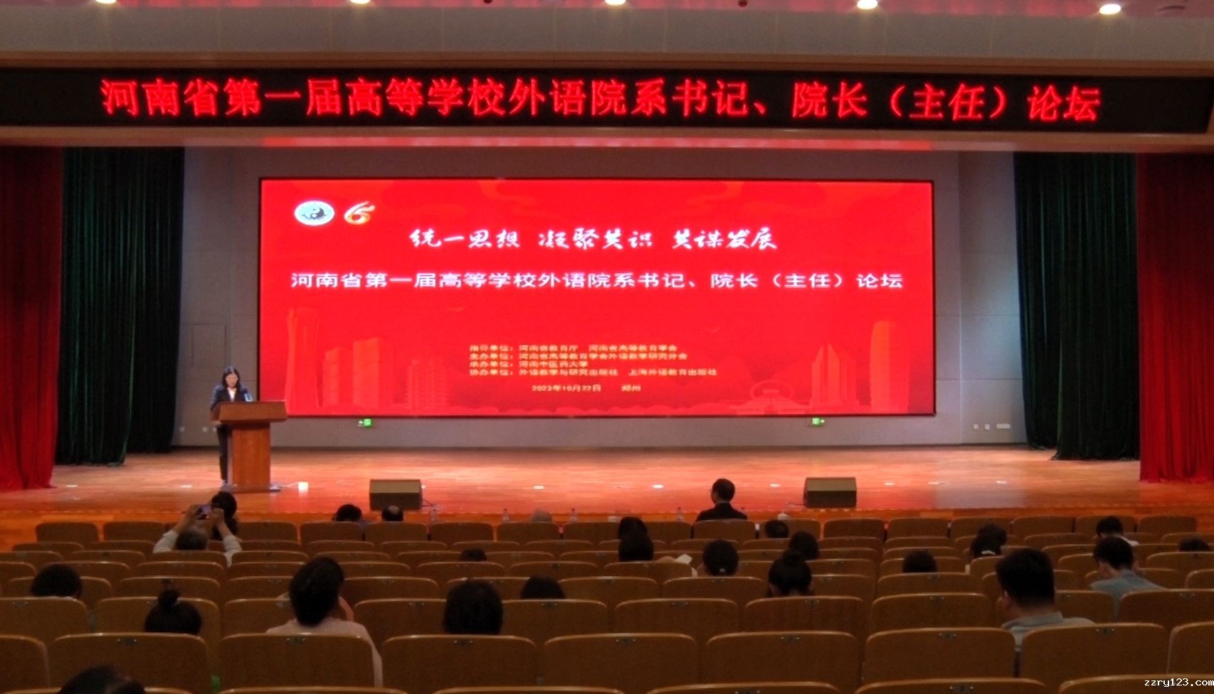 本网讯(文图/闫舒瑶 李蕊)2023年10月22日,在建校65周年之际,由河南省高等教育学会外语教学研究分会主办、我校承办河南省第一届高等学校外语院系书记、院长(主任)论坛在俊学综合实验楼B101举办。论坛以“统一思想,凝聚共识,共谋发展”为主题,全省高校外语院系书记、院长(主任)齐聚一堂,深入探讨党建引领外语教育发展的新理念、新方法,共同开启河南省高等外语教育发展的新征程、新篇章。河南省教育厅二级巡视员、河南省教育国际交流协会会长徐恒振,中共河南省委外事工作委员会办公室翻译室主任陈国良,河南省高等教育学会秘书长吴长运,北京外国语大学副校长孙有中教授,北京第二外国语学院副校长程维教授,外语教学与研究出版社副总编辑常小玲博士,开封市人大原副主任、河南大学外语学院原院长高继海教授,安阳工学院副校长万鹏杰教授,我校校长王耀献教授,河南省高等教育学会外语教学研究分会理事长、我校党委副书记张加民教授,河南省外国语言文学类教学指导委员会主任委员、郑州大学外国语与国际关系学院院长钱建成教授,郑州大学、河南大学等高校外语院系书记、院长(主任),我校外语学院师生代表等参加论坛。