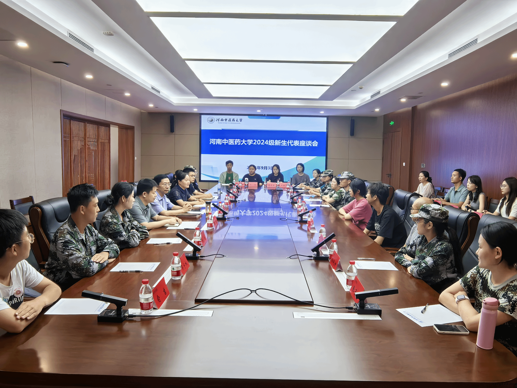 座谈会上,2024级新生代表畅所欲言,纷纷表达了入学后的感受和体验。耳闻已久的大长楼,军训场上的甘与苦,天一湖畔的黑天鹅,杏林餐厅的特色美食,教学楼里的朗朗书声,都给新生同学留下深刻的印象。大家被美丽的校园环境、良好的校风学风和浓厚的学术氛围深深吸引,对未来大学生活充满无限期待与向往。第一临床医学院新生胡成晨表示,从小受家人影响对中医药学情有独钟,能够来到医圣张仲景的故乡河南学习中医,感到很幸运也很开心。中医学院新生吴凯表示,自己阔别校园多年,再次选择步入大学,希望能够系统学习中医学知识,通过传统医学与生物工程的交叉融合研究,助推中医药现代化。