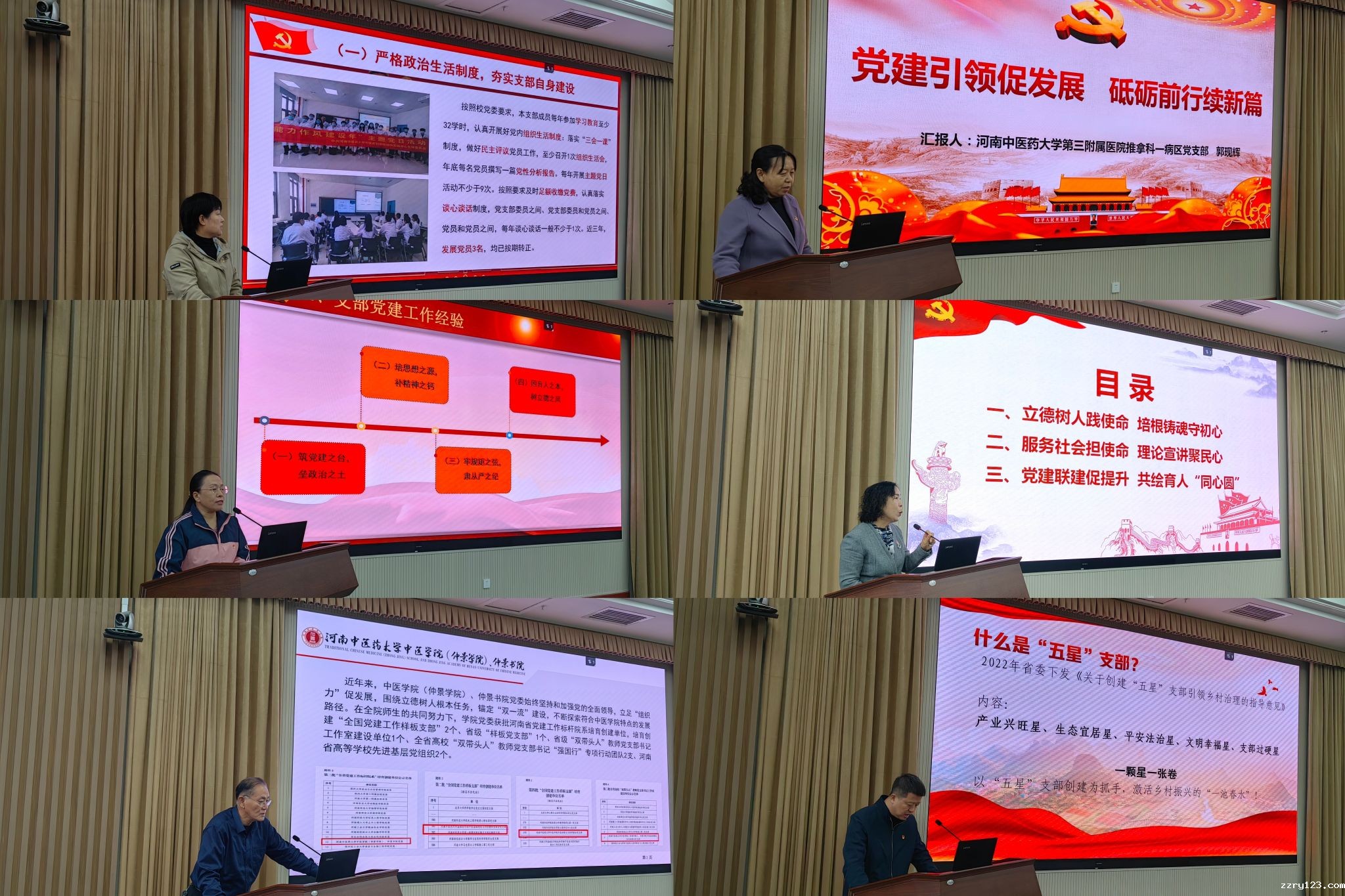 交流会上,党委组织部部长曹猛首先汇报了我校近年来“全省党建工作示范高校”建设暨“三级联创”工作有关情况,并对基层党组织换届、科级干部培训、进一步加强基层党组织标准化规范化建设等工作进行安排。全省“五星”支部——学校定点帮扶村信阳市固始县武庙集镇皮冲村党支部书记王北溟,2个教育部高校“双带头人”教师党支部书记“强国行”专项行动团队——马克思主义学院马克思主义中国化研究党支部书记刘金鸽,第三附属医院、针灸推拿学院推拿科一病区党支部书记郭现辉,全国党建工作样板党支部——中医学院中医诊断与方剂学联合党支部书记车志英,全省党建工作标杆院系——中医学院(仲景学院)、仲景书院党委书记袁晓宇;全省党建工作样板支部——中医药科学院动物实验中心党支部书记孙瑞芹分别围绕“三级联创”工作的主要做法、特色亮点、成效不足和下一步工作思路进行了工作交流。