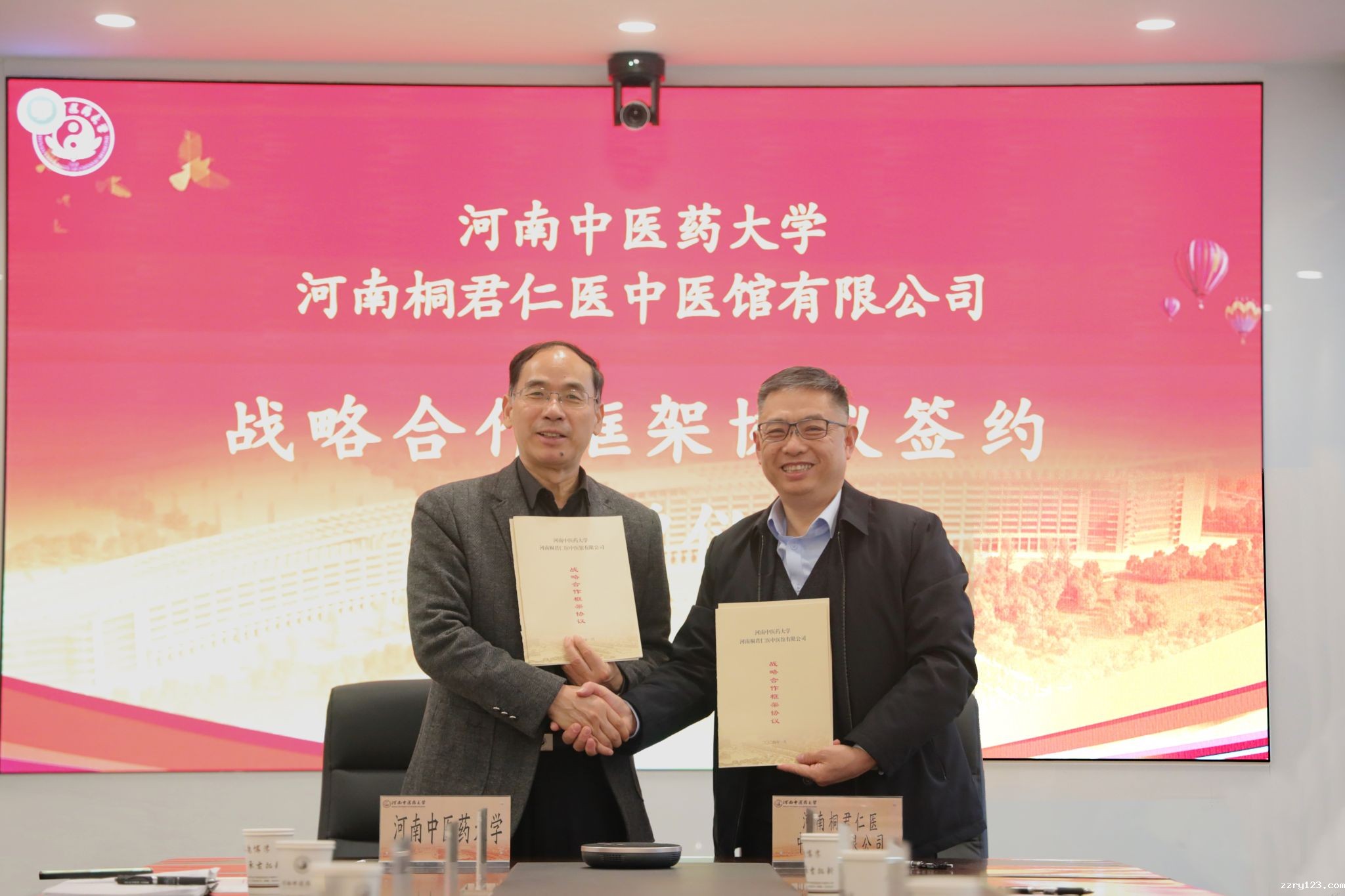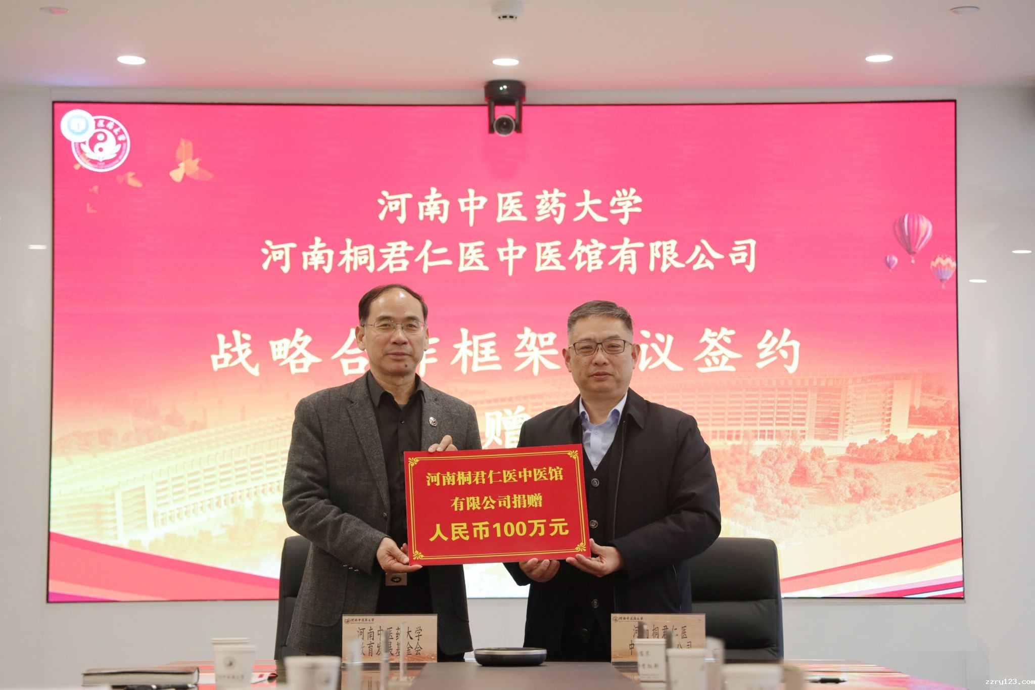 本网讯(文/图 常征辉)2024年1月9日,我校与河南桐君仁医中医馆有限公司合作框架协议签约暨捐赠仪式在俊学综合实验楼10楼会议室举行。河南桐君仁医中医馆有限公司董事长桂伟、总经理姚琼,学校党委副书记张加民、教育发展基金会理事长王剑锋出席了仪式。仪式由校友与社会合作办公室主任施淼主持。