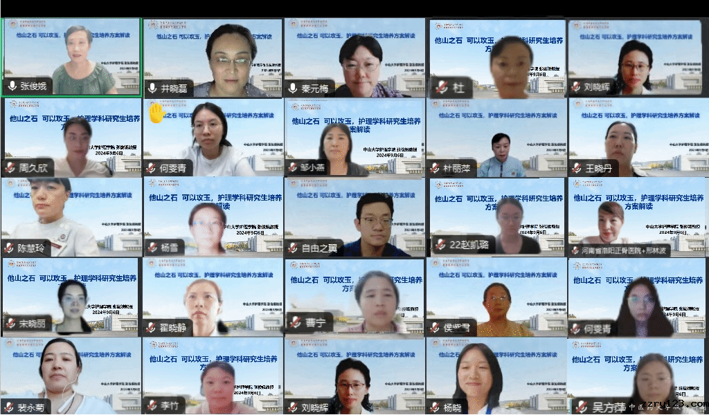 本网讯(文/刘洁 何雯青 图/ 刘洁)为优化学科建设与研究生培养方案的内容与结构,增强我校导师在研究生培养方面的专业素养,2024年9月6日,护理学院(智慧康养护理行业学院)邀请中山大学护理学院院长张俊娥教授进行专题讲座,为我校师生带来了一场知识与智慧的盛宴。学院全体教师、研究生导师、研究生及实习基地带教老师参加讲座,其中线上参与近百人,线下到场40人,讲座由学院院长秦元梅主持。