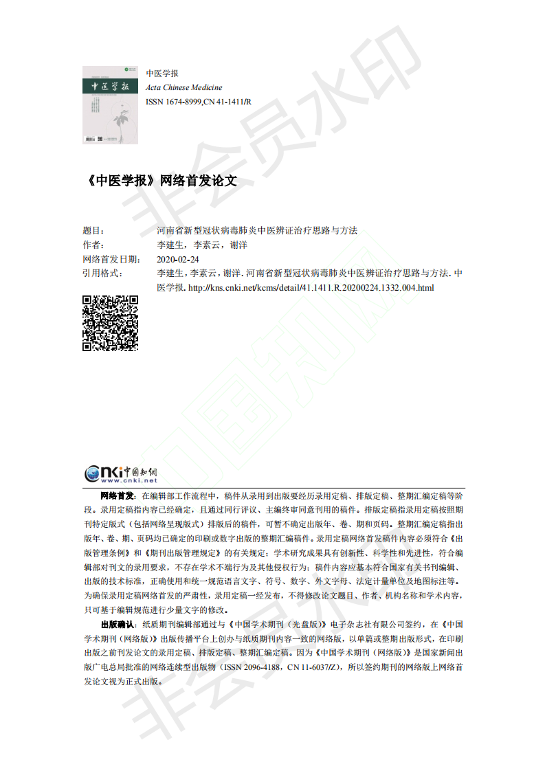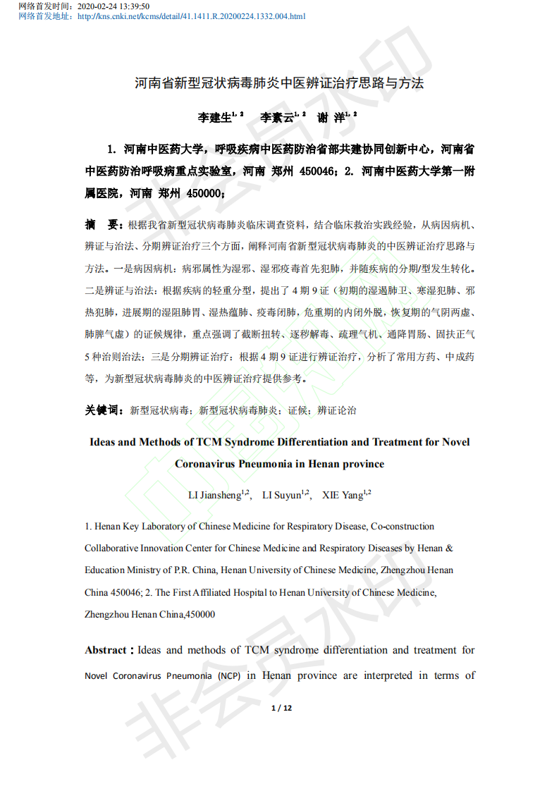 《中医学报》网络首发李建生教授论文《河南省新型冠状病毒肺炎中医辨证治疗思路与方法》