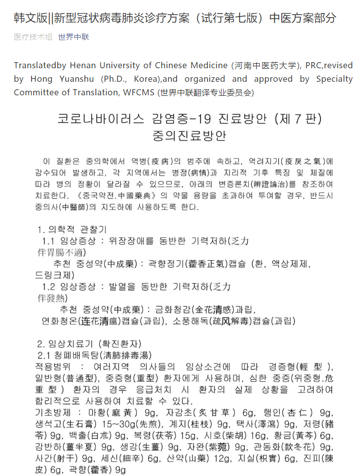 本网讯(文图/潘万旗 朱剑飞 杨晓娜)近期,由世界中医药学会联合会组织、我校主要承担、我校来华留学生参与翻译的《新型冠状病毒肺炎诊疗方案(试行第七版)•中医方案部分》韩语、乌尔都语两个版本,在世界中医药学会联合会官方媒体对外发布。译本分享了中医药抗“疫”方案和成功经验,为中医药走出国门、走向世界起到了良好的促进作用,为构建人类卫生健康共同体做出了应有贡献。