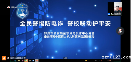本网讯(文/张二涛 图/张雯)全民警惕防电诈,警校联动护平安。为进一步推进防诈宣传进校园,做好普法宣讲,依法治理活动,2022年4月21日下午18:00,儿科医学院通过腾讯会议举办线上春季学期安全教育主题讲座,特邀郑州市公安局金水分局反诈中心民警上官轲轲主讲。儿科医学院党委副书记杨小红、学工办主任姚明超、儿科医学院全体学生参加讲座。讲座由学工办副主任张二涛主持。