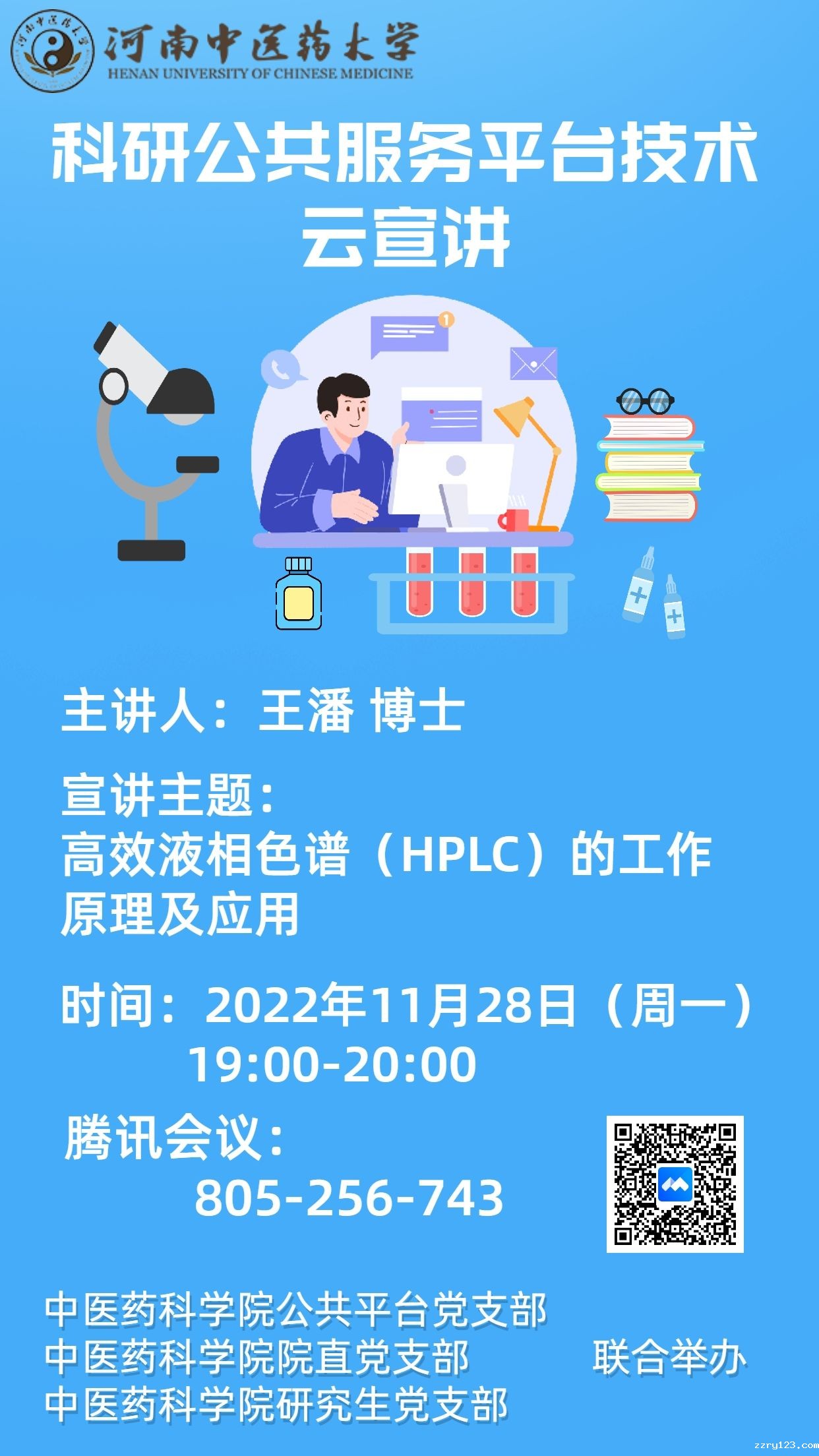 本次宣讲主题:高效液相色谱(HPLC)的工作原理及应用;时间:11月28日(周一)19:00-20:00;主讲人:王潘博士。扫描海报二维码即可观看直播,欢迎广大师生参与。