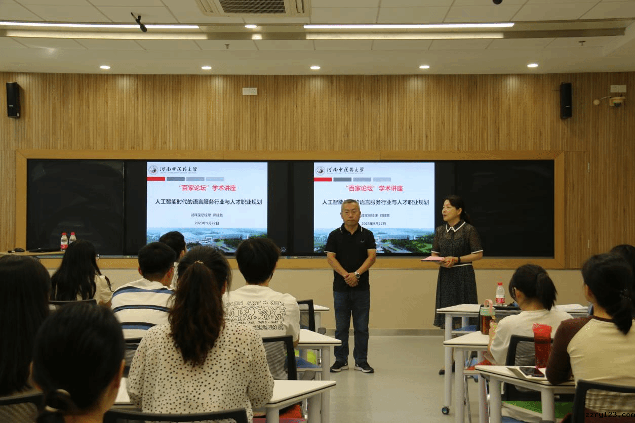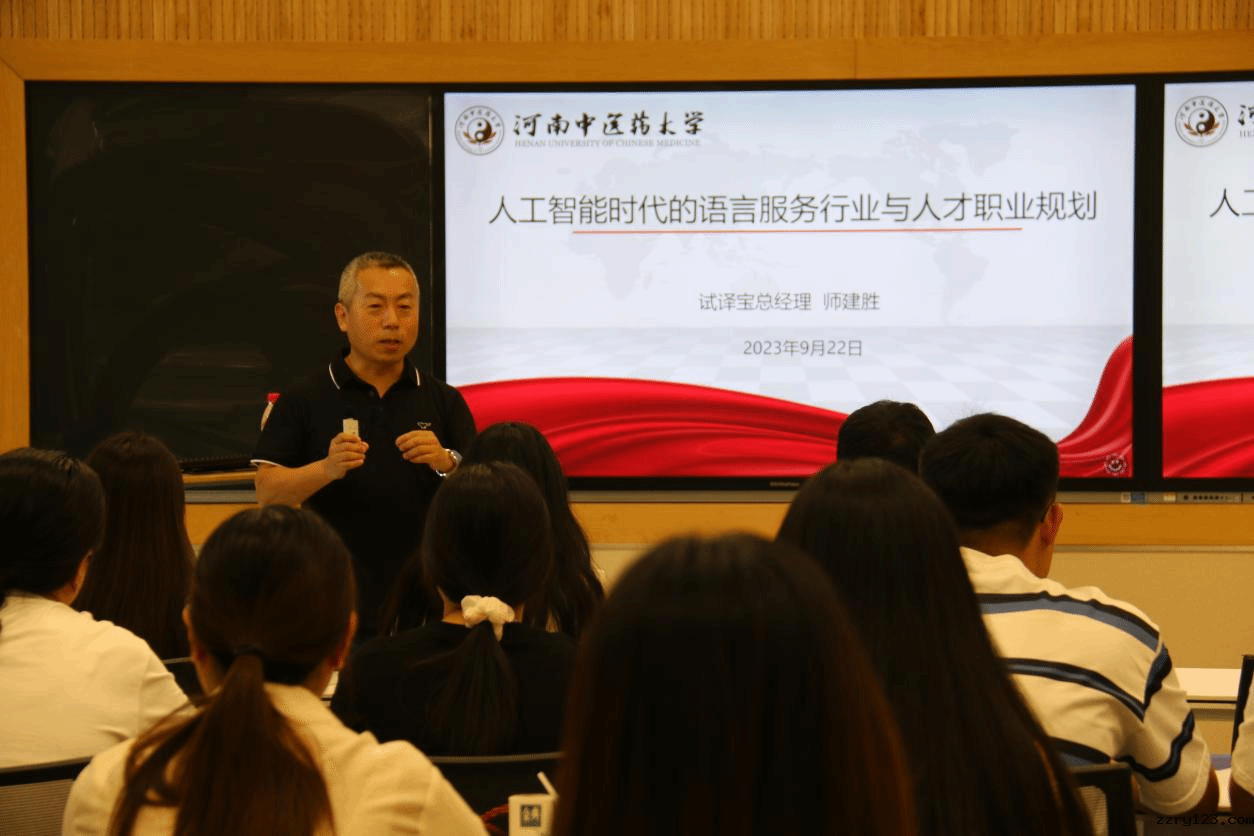 本网讯(文图/蒋宜轩)2023年9月22日,外语学院邀请试译宝总经理师建胜做客我校百家论坛,开展主题为“人工智能时代的语言服务行业与人才职业规划”的学术讲座,我校教师、研究生及本科生60余人听讲座,讲座由外语学院副院长朱文晓主持。