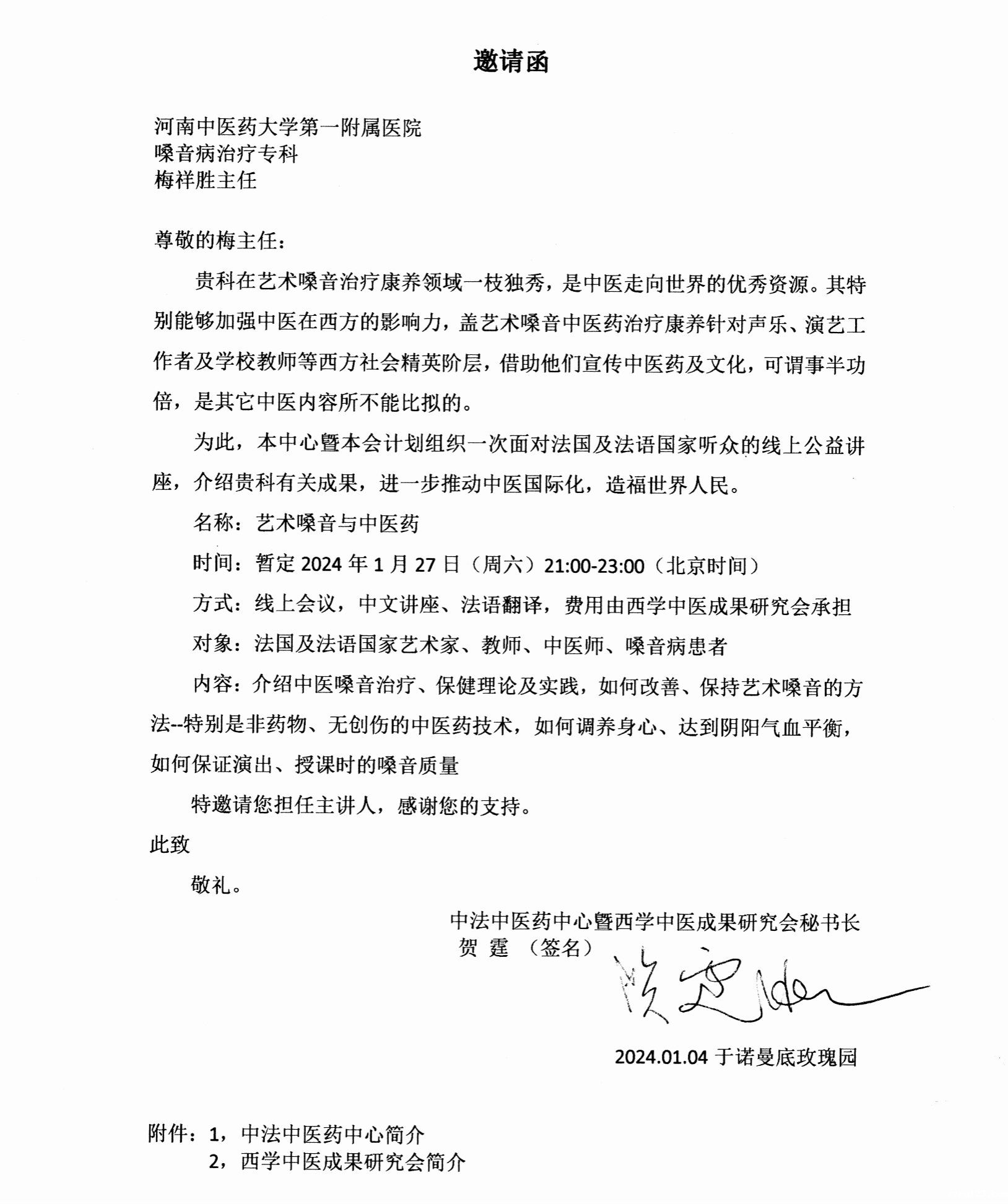 2024年1月27日,梅祥胜受“法国·中法中医药中心”邀请,参加了一场跨国线上的学术交流。交流会上他不但以“嗓音与中医”为主题普及中医药文化知识,还现场与法国歌唱家积极互动,悉心指导有关嗓音保护和发声问题,受到了一致称赞。