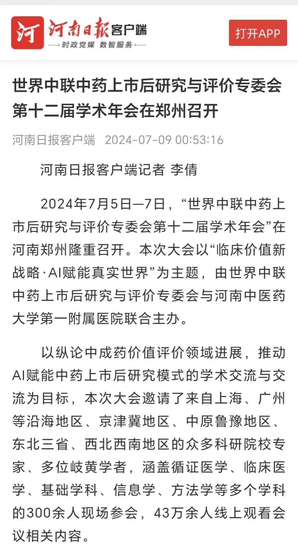 2024年7月5日—7日,“世界中联中药上市后研究与评价专委会第十二届学术年会”在河南郑州隆重召开。本次大会以“临床价值新战略·AI赋能真实世界”为主题,由世界中联中药上市后研究与评价专委会与星空平台官网莱切战略伙伴第一附属医院联合主办。