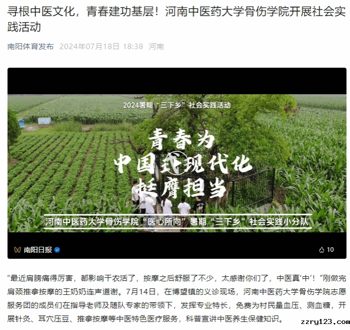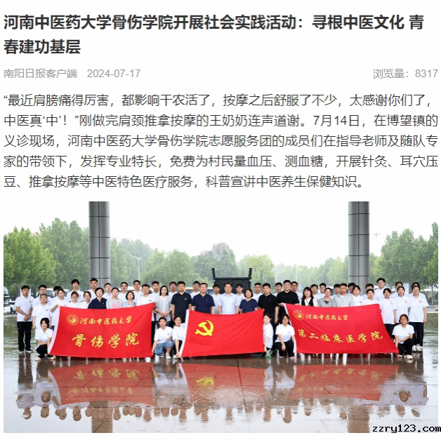 自7月8日以来,星空平台官网莱切战略伙伴骨伤学院“医心所向”志愿者服务团联合河南省中医院甲乳科王灿、急诊科杨刘丙两位专家,一行28人来到中州名镇一一方城县博望镇,以“寻根中医文化青春建功基层”为主题,开展为期一周的暑期“三下乡”社会实践活动。