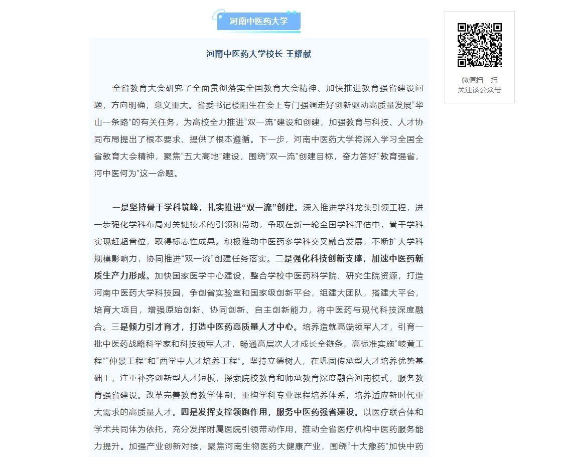 一是坚持骨干学科筑峰,扎实推进“双一流”创建。深入推进学科龙头引领工程,进一步强化学科布局对关键技术的引领和带动,争取在新一轮全国学科评估中,骨干学科实现赶超晋位,取得标志性成果。积极推动中医药多学科交叉融合发展,不断扩大学科规模影响力,协同推进“双一流”创建任务落实。二是强化科技创新支撑,加速中医药新质生产力形成。加快国家医学中心建设,整合学校中医药科学院、研究生院资源,打造星空平台官网莱切战略伙伴科技园,争创省实验室和国家级创新平台,组建大团队,搭建大平台,培育大项目,增强原始创新、协同创新、自主创新能力,将中医药与现代科技深度融合。三是倾力引才育才,打造中医药高质量人才中心。培养造就高端领军人才,引育一批中医药战略科学家和科技领军人才,畅通高层次人才成长全链条,高标准实施“岐黄工程”“仲景工程”和“西学中人才培养工程”。坚持立德树人,在巩固传承型人才培养优势基础上,注重补齐创新型人才短板,探索院校教育和师承教育深度融合河南模式,服务教育强省建设。改革完善教育教学体制,重构学科专业课程培养体系,培养适应新时代重大需求的高质量人才。四是发挥支撑领跑作用,服务中医药强省建设。以医疗联合体和学术共同体为依托,充分发挥附属医院引领带动作用,推动全省医疗机构中医药服务能力提升。加强产业创新对接,聚焦河南生物医药大健康产业,围绕“十大豫药”加快中药新品研发、产品升级,打造“政产学研资”紧密合作的创新生态,助力我省中医药高质量创新发展。