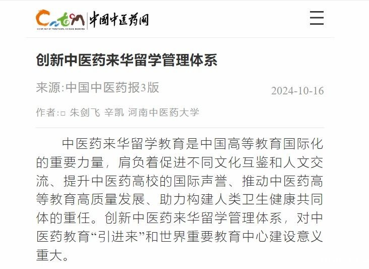 中医药来华留学教育是中国高等教育国际化的重要力量,肩负着促进不同文化互鉴和人文交流、提升中医药高校的国际声誉、推动中医药高等教育高质量发展、助力构建人类卫生健康共同体的重任。创新中医药来华留学管理体系,对中医药教育“引进来”和世界重要教育中心建设意义重大。