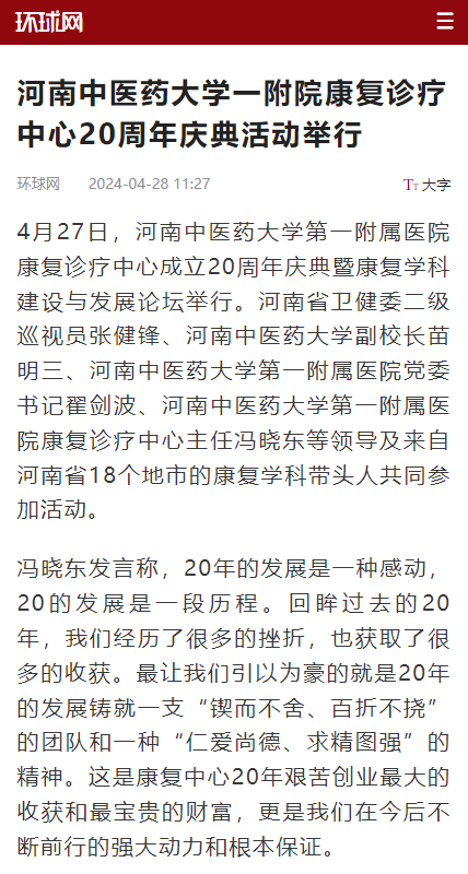 环球网丨一附院康复诊疗中心举办二十周年庆典暨河南省康复学科建设与发展论坛