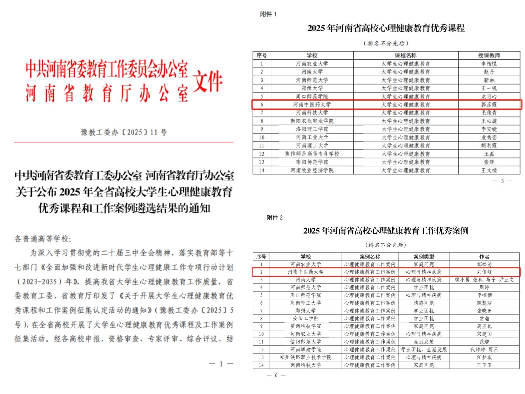 本网讯(文图/王海飞 刘俊岐)近日,河南省委教育工委、河南省教育厅发布《关于公布2025年全省高校大学生心理健康教育优秀课程和工作案例遴选结果的通知》,我校郭彦霞老师主讲的《大学生时间管理》获评“2025年河南省高校心理健康教育优秀课程”,刘俊岐老师申报的工作案例获评“2025年河南省高校心理健康教育工作优秀案例”。