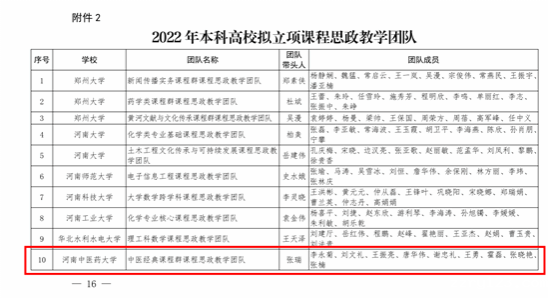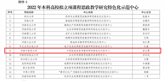 本网讯(文/图 王金淼)近日,河南省教育厅下发了《关于公布河南省2022年本科高校课程思政项目建设名单的通知》。经学校推荐、专家评审、结果公示等环节,我校申报的《中医基础理论》等6门课程被认定为河南省2022年本科高校课程思政样板课程,中医经典课程群课程思政教学团队为河南省2022年本科高校课程思政教学团队,中西医临床医学教学研究特色化示范中心为河南省2022年本科高校课程思政教学研究特色化示范中心。目前,我校已认定19门省级课程思政样板课程、立项3个省级课程思政教学团队和1个省级课程思政教学研究特色化示范中心。