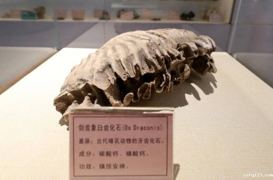 剑齿象臼齿是中药馆的镇馆之宝。该标本于上世纪60年代出土于河南中医学院城北路家属院,经专家鉴定,系剑齿象的牙齿化石,是远古时代中原人吃大象遗留下来的。因为远古时期的河南,也就是黄河中下游地区河流纵横,森林茂密,野象众多,河南又被形象地描述为人牵象之地,这就是象形字“豫”的根源,也是河南简称“豫”的由来。剑齿象臼齿化石不仅可被视为中药,也是河南简称的佐证,称之为镇馆之宝,名副其实。